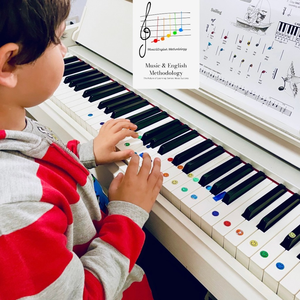 My method starts with this whole-child approach. It then grows into a true science of learning, where colors are the main key. They help kids quickly understand a “vision board” – a clear picture of how music works. Colors help them see the difference between spaces and notes (high and low sounds) on both the music staff and the piano keyboard.